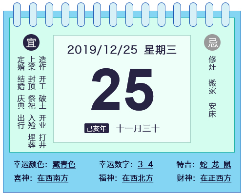 宜:造作、开工、破土、开业、打井、上梁、封顶、祭祀、入殓、埋葬、定婚、结婚、庆典、出行。