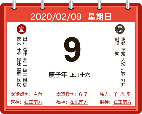 2020年2月9日 星期日 农历庚子年正月十六