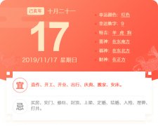现代人在做重要事情时都会去选择一个吉日吉时,以此让自己所做之事事半功倍。那么2019年11月21号的日子如何呢?是不是黄道吉日呢?我们随着皇极易经风水网的风水大师秦华一起来看看。 详细信息